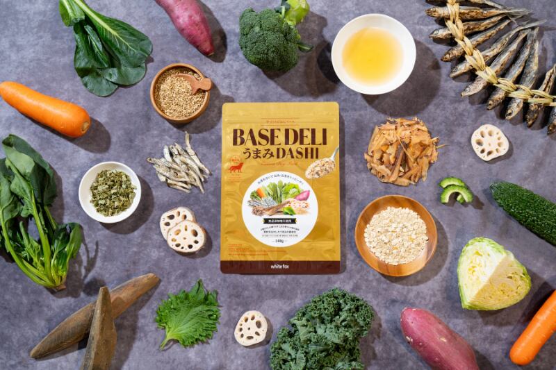 主食となる肉・魚・たまごなどのタンパク源に、そっと加えるだけで微生物と植物の元気を加えてくれるベースデリDASHI、食材を揃える手間を省いてもっと美味しく、愛犬との食事がもっと楽しい ひとときになれば幸いです。